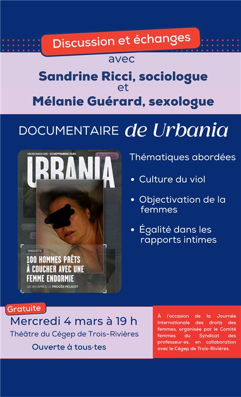 L’activité est organisée par le Comité femmes du Syndicat des professeur·es. L’ensemble de la communauté collégiale ainsi que le grand public sont invités à cette soirée!