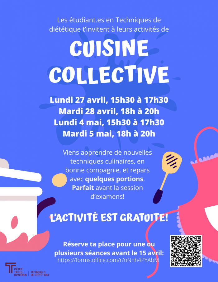Les cuisines collectives sont toujours actives et son fonctionnement est bien simple. Concrètement, chaque groupe se rencontre pour cuisiner ensemble des repas et collations à faible coût. Les activités sont chapeautées par une enseignante du département de diététique et ont lieu dans les laboratoires de cuisine du département (SA3002).
