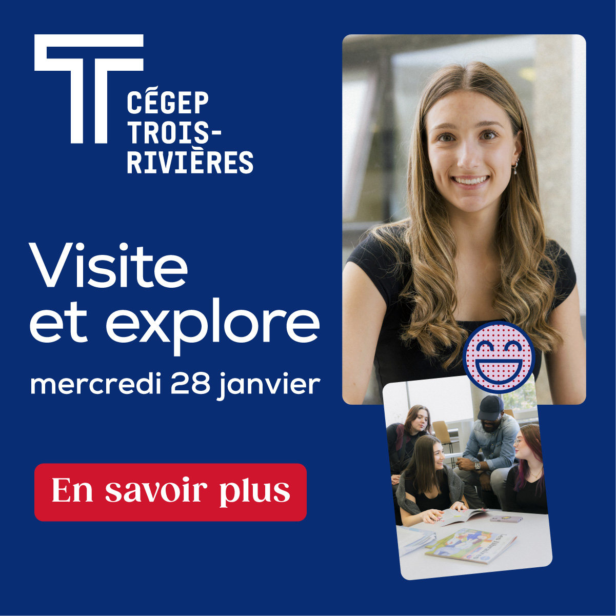 Le mercredi 28 janvier, de 18 h à 20 h 30, le Cégep de Trois-Rivières ouvrira ses portes aux futurs étudiants et étudiantes pour la soirée Visite et explore. À quelques semaines du 1er mars, date de fin du 1er tour des admissions au collégial, les participants et participantes profiteront d’un accès privilégié dans les programmes d’études pour confirmer leur choix. Ce sera aussi l’occasion pour les élèves d’autres niveaux d’explorer différentes possibilités de formations.